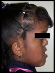 "The patient appeared to be well-adjusted, healthy and intelligent but had speech difficulty. She was 100â cm tall at the initial visit. Extra-oral examination revealed classical manifestations associated with achondroplasia such as short stature, short stubby trident hands, frontal bossing, saddle nose, severe midface hypoplasia and incompetent lips. Mouth breathing, interlabial gap of about 12 mm at rest and hyperactive mentalis were noticed. Lip closure was not possible without muscle strain. A concave facial profile was also noticed, however the mandible appeared normal and the chin was not prominent.