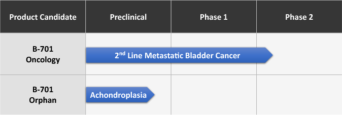 B-701 is in preclinical testing for achondroplasia for which FGFR3 antagonism may be beneficial. BioClin has completed a 6-month dosing study in juvenile monkeys and they are conducting further studies to advance this program.