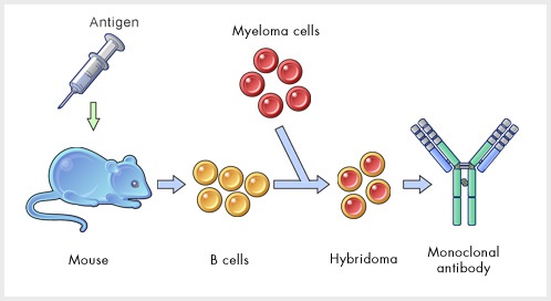 Hybridomes have the characteristics of the two different types of cells, and are able to both produce antibodies and reproduce infinitely. Credits: http://kyowa-kirin.com/antibody/about_antibody/production.html. |