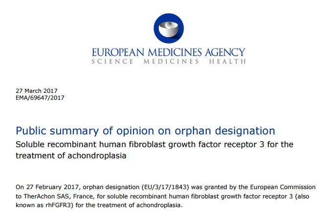 - 27 Feb 2017 - TA 46 received Orphan Drug status for Achondroplasia by the European Medicines Agency, EMA