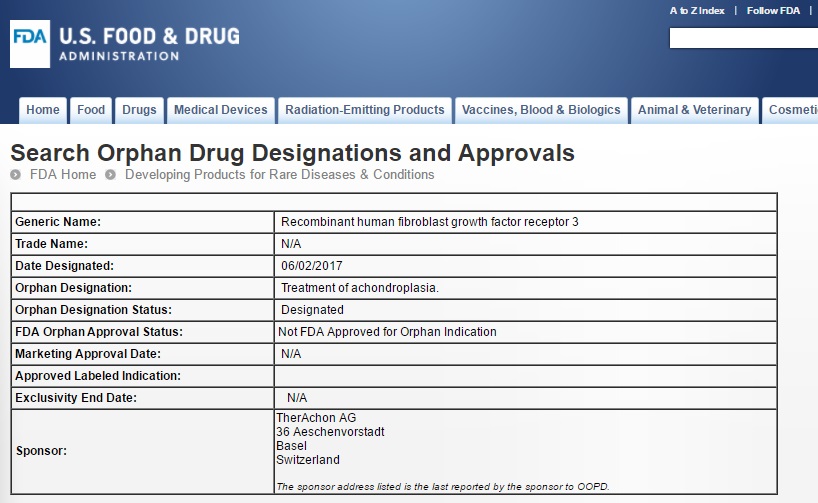 - 2 Jun 2017 - TA 46 received Orphan Drug status for Achondroplasia by the US Food and Drug administration, FDA