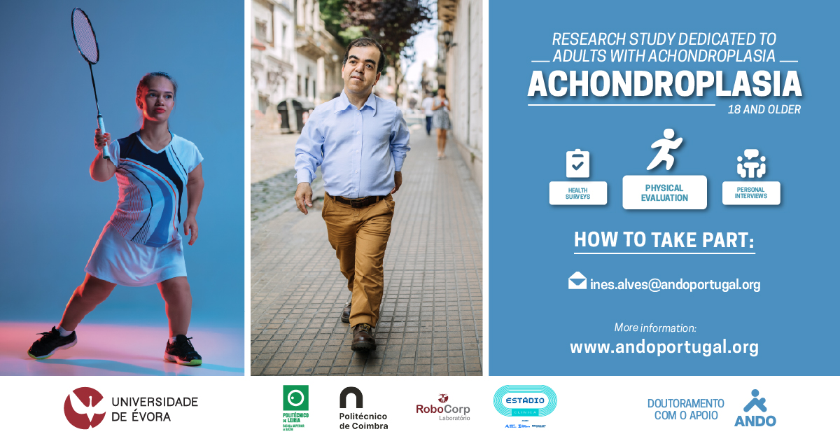 Inês Alves, ANDO Portugal founder, is leading a doctoral research program by Évora University on "Physical, Biomechanical, Nutritional and Psychological Characterization of adults with Achondroplasia, associated to physical activity, exercise and sports". This is an academic study supported by ANDO Portugal - National Organization for Skeletal Dysplasia.