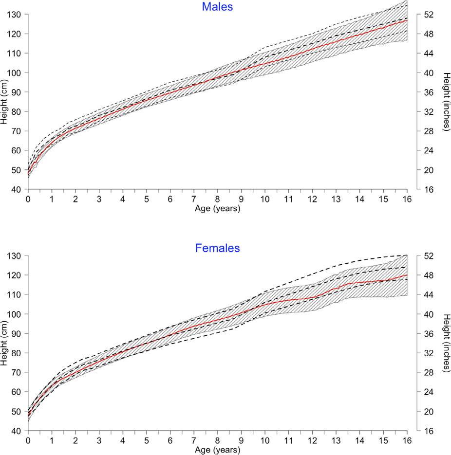 Curvas de percentil de altura em crianças e jovens com acondroplasia.
